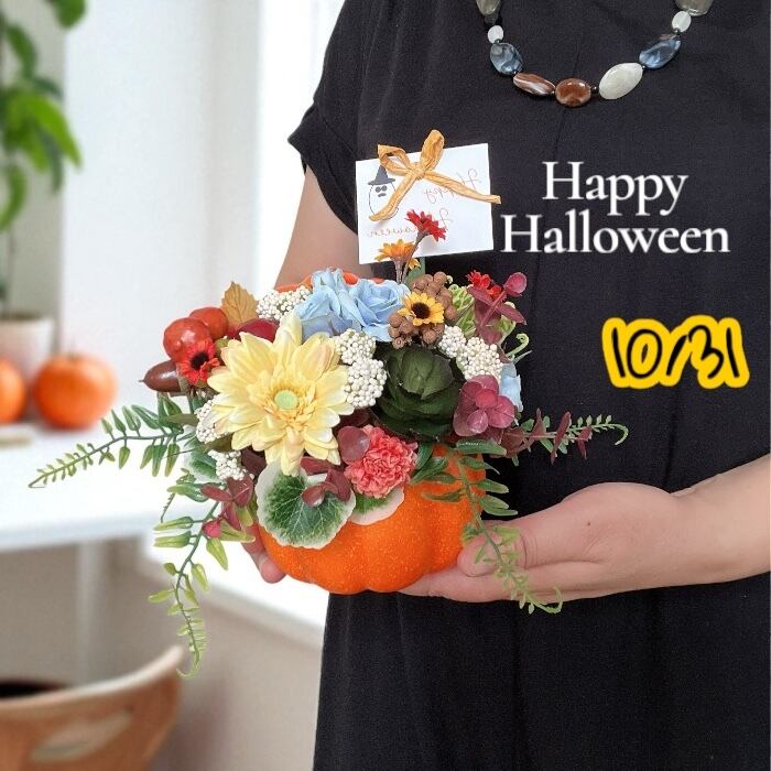 こちらの商品は、ハロウィンをお祝いするためにデザインされた可愛らしいかぼちゃアレンジです。お部屋やキャンドルの周りに飾ることで、心躍るハロウィンの雰囲気を演出します。