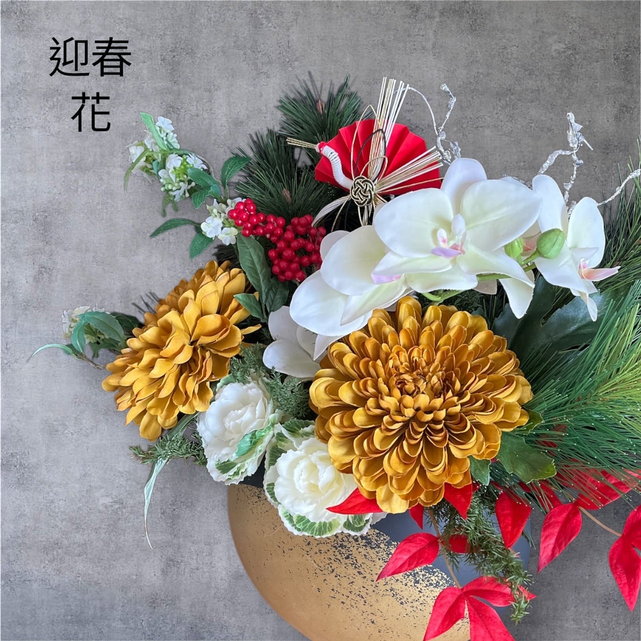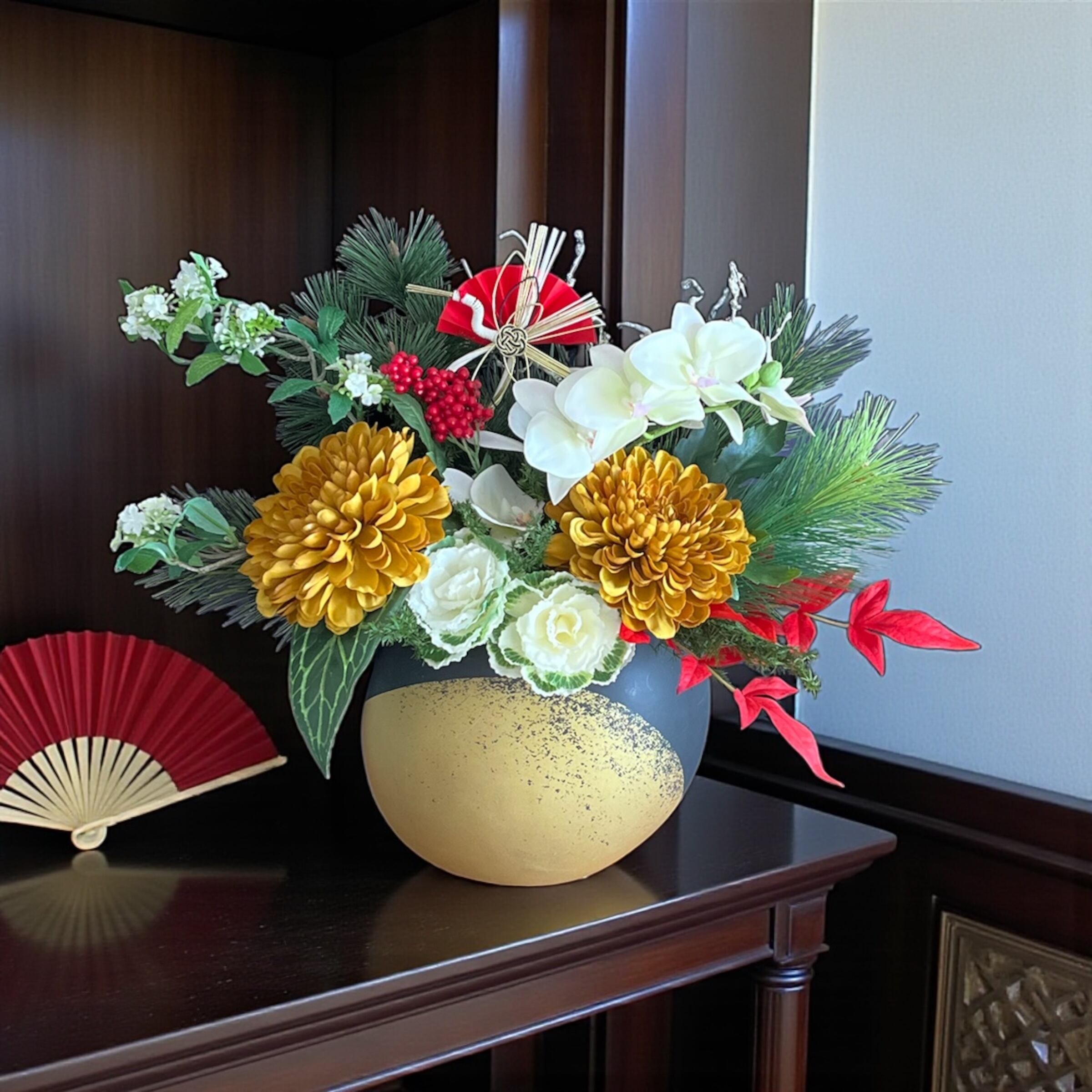 この「お正月アレンジメント(胡蝶蘭)」は、優雅な胡蝶蘭と、かっこいい五葉松を組み合わせた作品です。見る人の心を和ませる美しさは、特にお正月の雰囲気にぴったりです。アーティフィシャルフラワーを使用しているため、手間をかけずにその美しさを長く楽しむことができ、シーズンが終わった後もインテリアとして活用いただけます。今人気の和モダンスタイルのお花を飾って新年のスタートを華やかに飾るためのアイテムに、ぜひご利用ください。