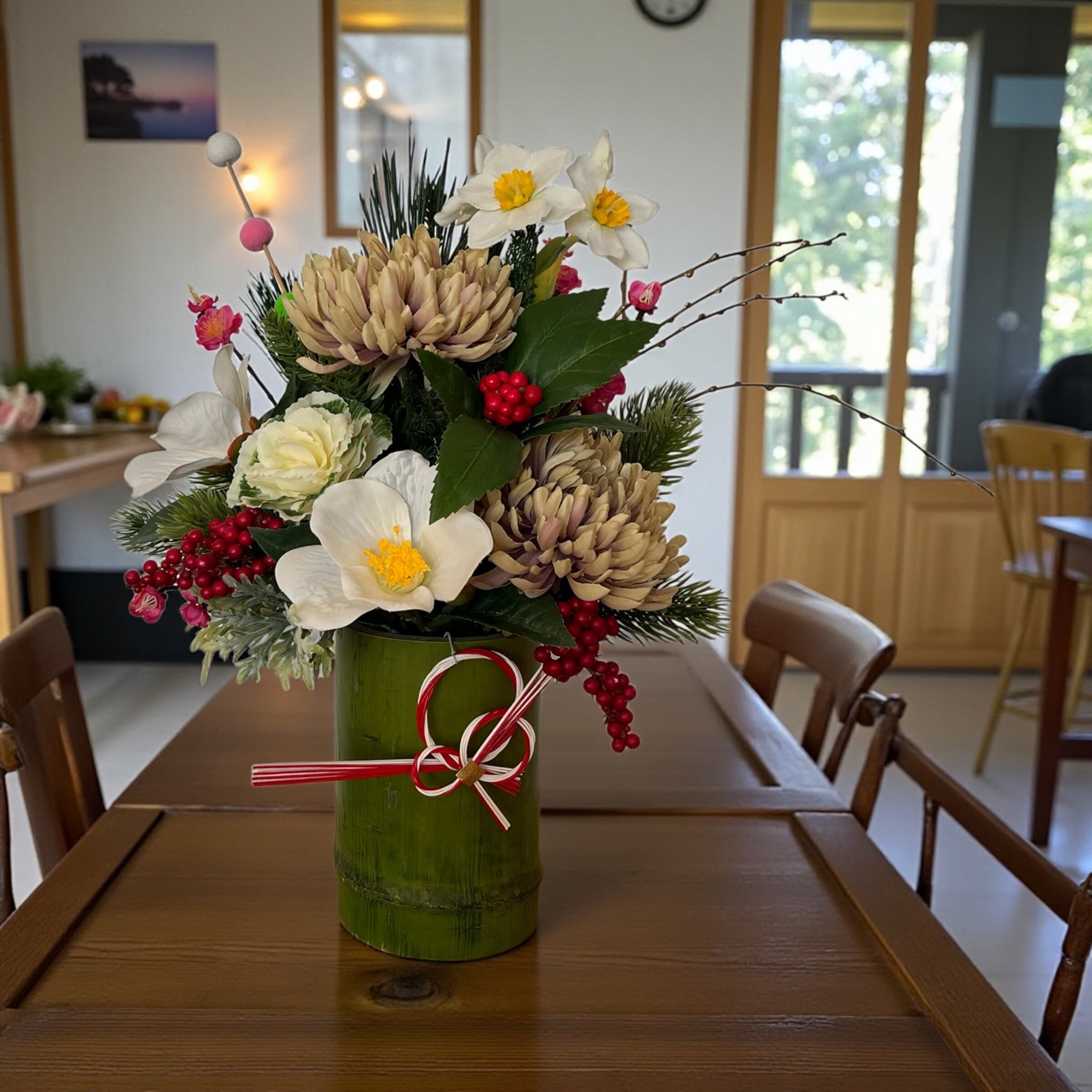 アーティフィシャルフラワーを使用しています。独自のデザインは、見る人の心を和ませると共に、日本の伝統を現代的に表現します。手間をかけずにその美しさを長期間楽しむことができ、日々の生活に心豊かな時間をもたらします。年末年始を共に過ごすアイテムにぜひご利用いただければ幸いです。