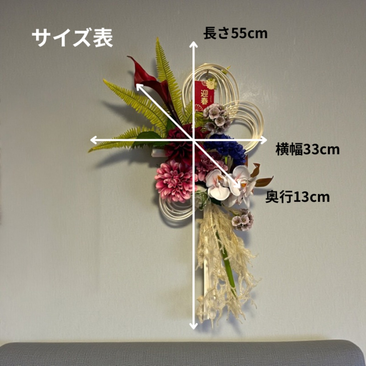 この「ラタンの注連飾り」は、新年を祝うためにデザインされたアイテムです。アーティフィシャルフラワーを使用することで長く美しさを保ち、手間いらずで楽しんでいただけます。お正月が終わった後も、インテリアとしてお使いいただけ、又袋や箱などに大切に保管すると翌年以降も飾れるのも魅力です。穏やかで華やかな新年を、この注連飾りとともに迎えていただければ幸いです。