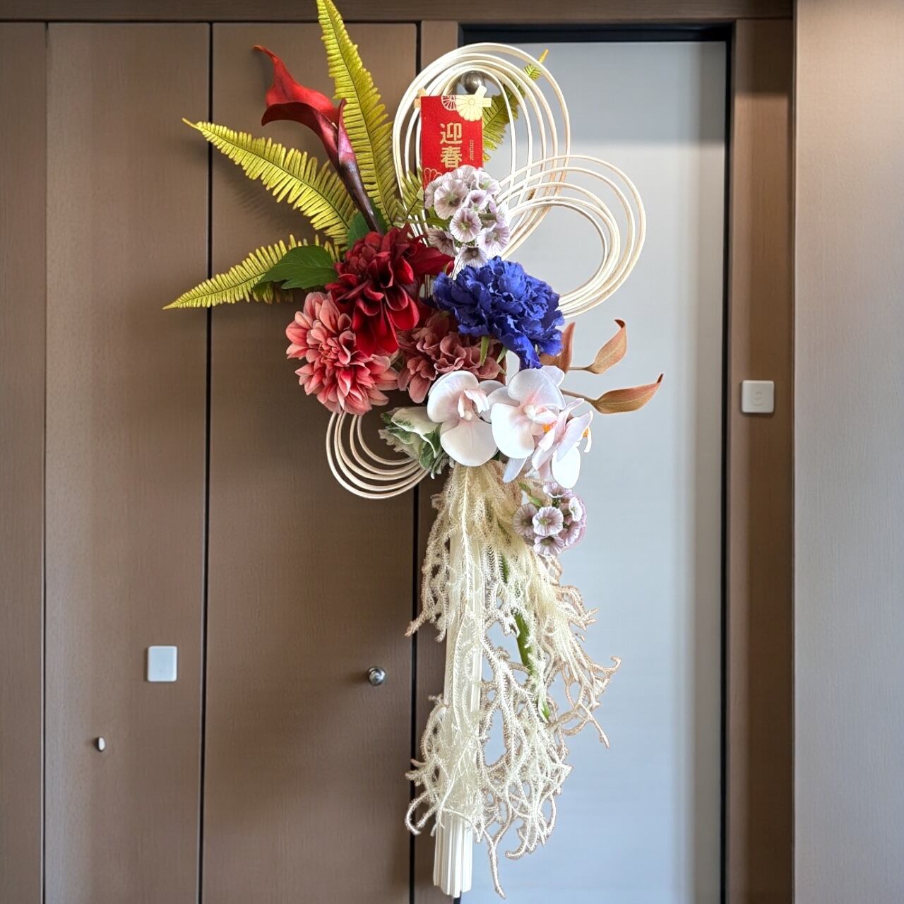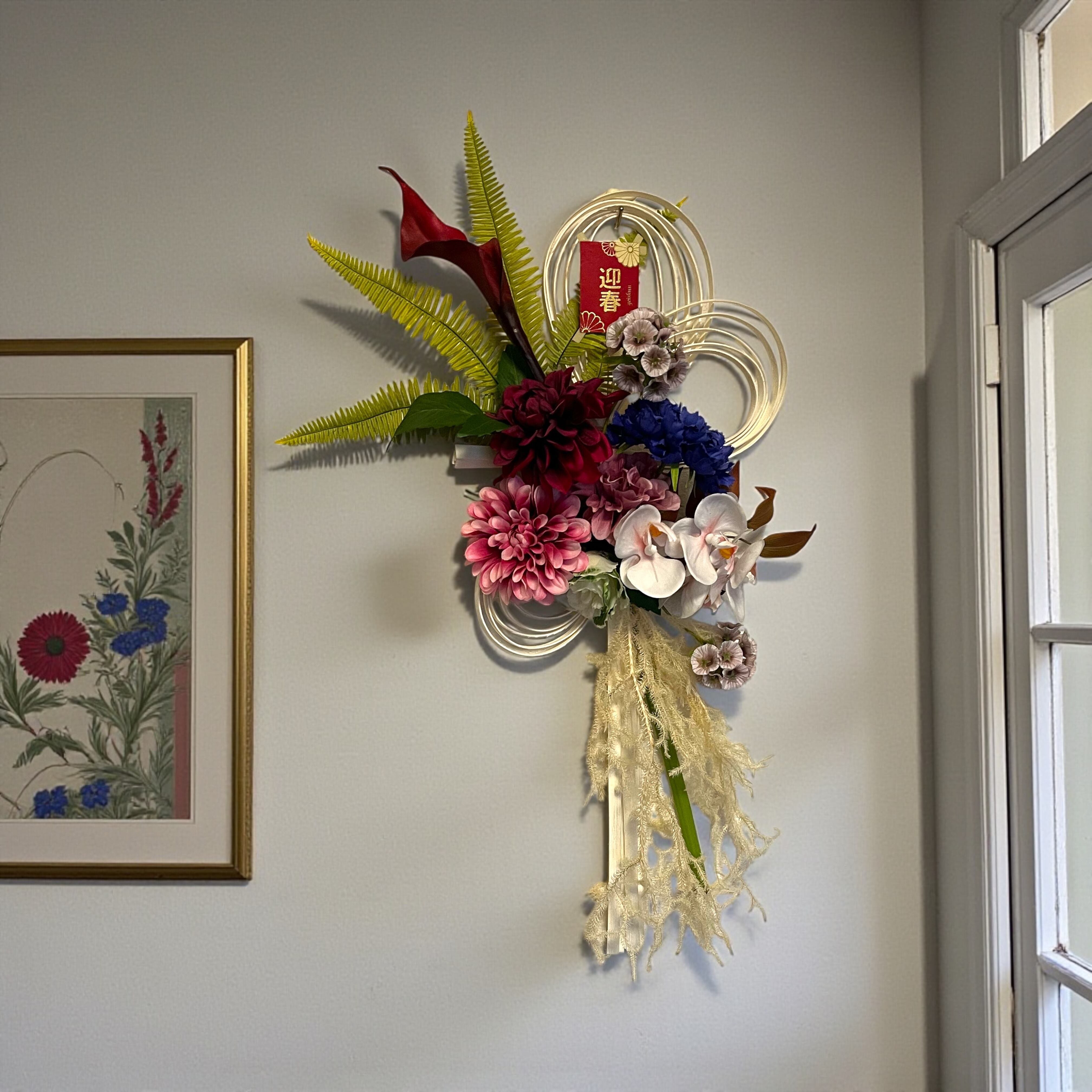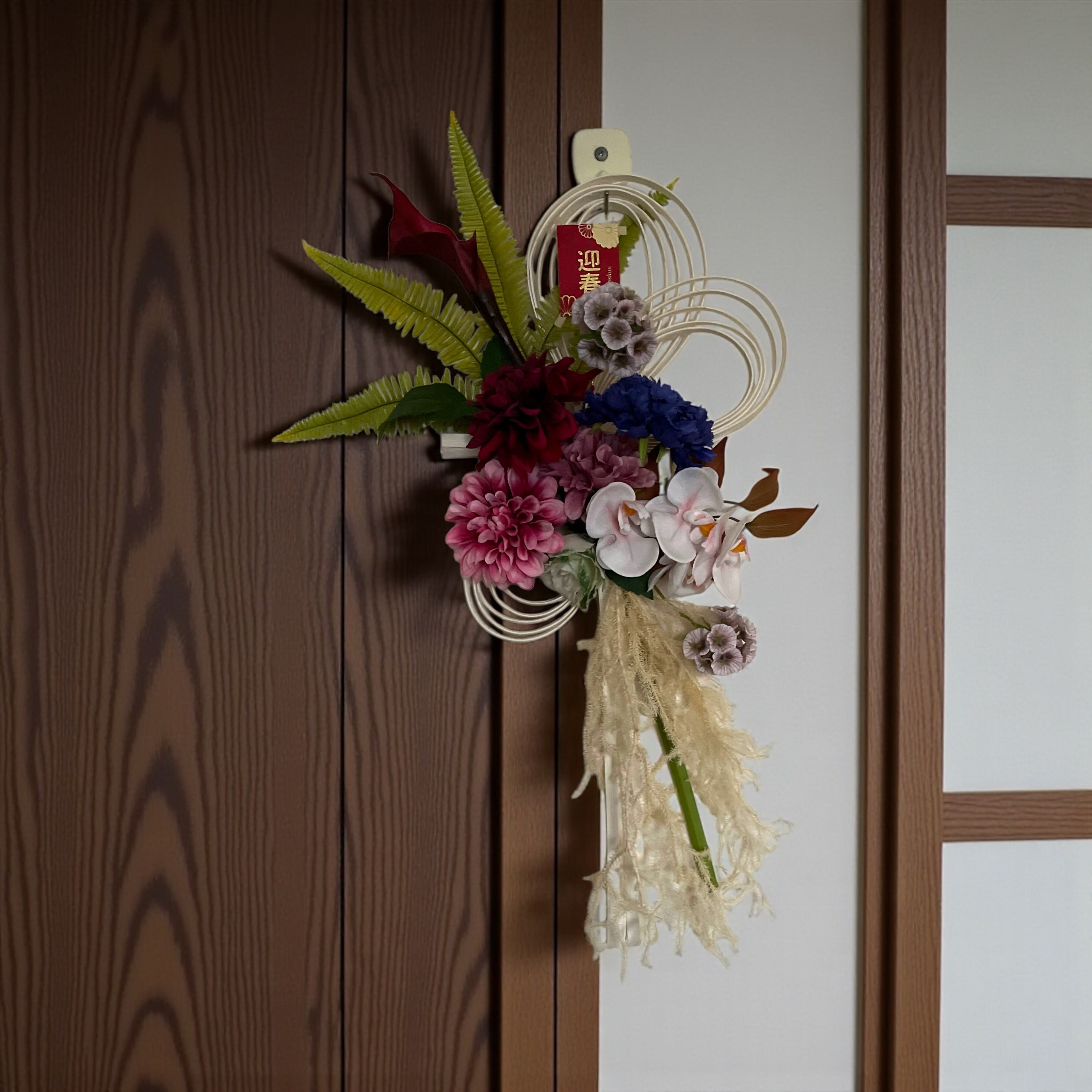 ♦︎こちらの商品は、お正月を彩る「ラタンの注連飾り」です。アーティフィシャルフラワーを使用しており、華やかなデザインが特長です。ラタンの素朴な質感と色とりどりの花材が組み合わさり、伝統的な注連飾りを新しいスタイルで表現しました。玄関やリビングに飾ることで、お正月の雰囲気を一層引き立てます。