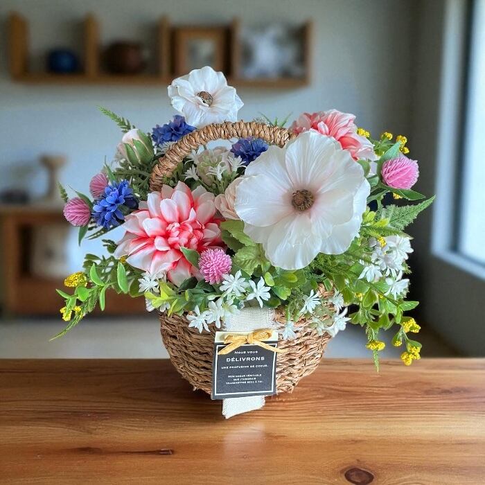 この「ミニバスケットアレンジ」は、可愛らしさとナチュラル感を大切にデザインされました。選び抜かれたアーティフィシャルフラワーによって、長い間その美しさを楽しむことができます。優しいピンクの色合いが、訪れる人々に癒しを与え、居心地の良い空間を提供します。また、季節を問わずインテリアフラワーとして楽しめる点がこのアレンジメントの大きな魅力です。