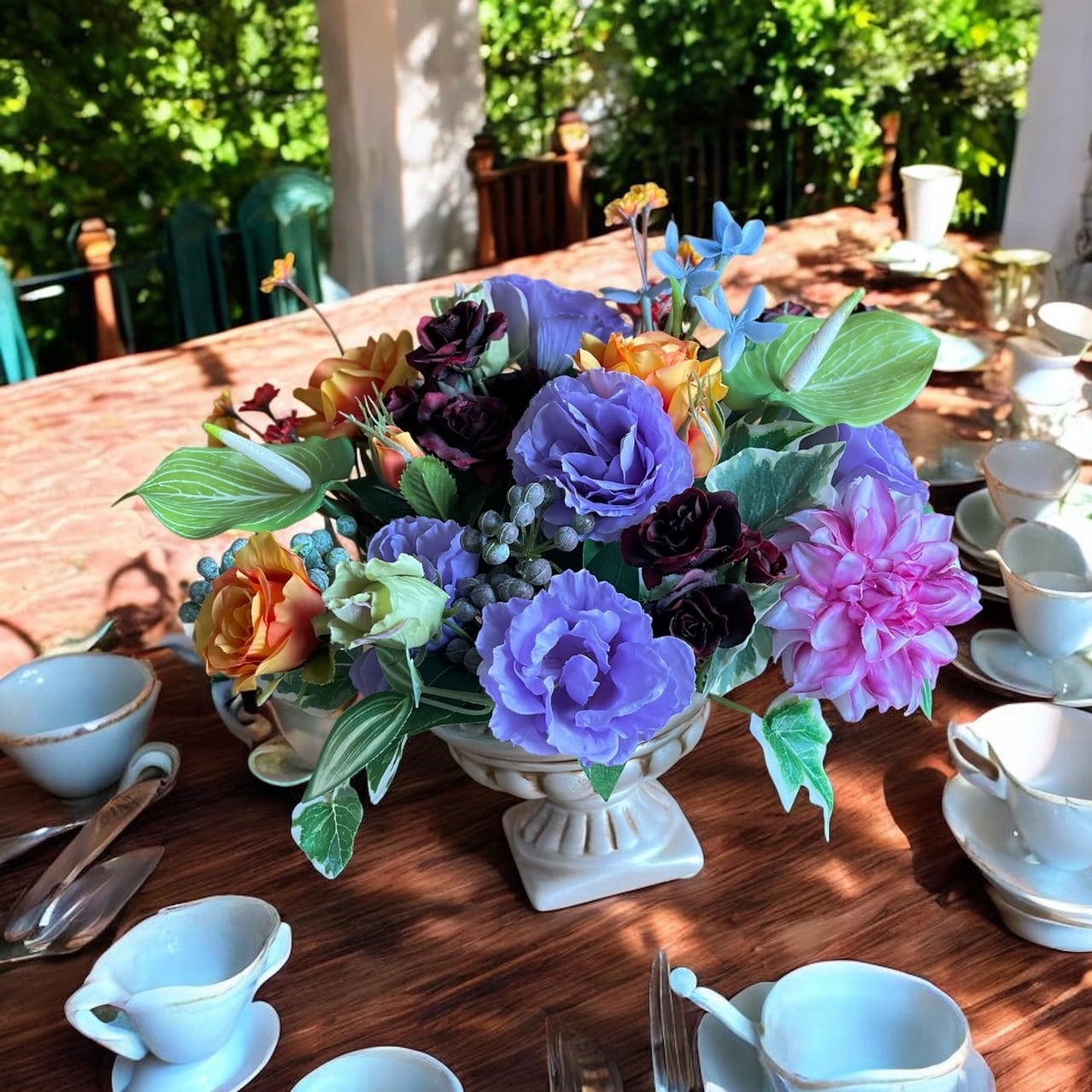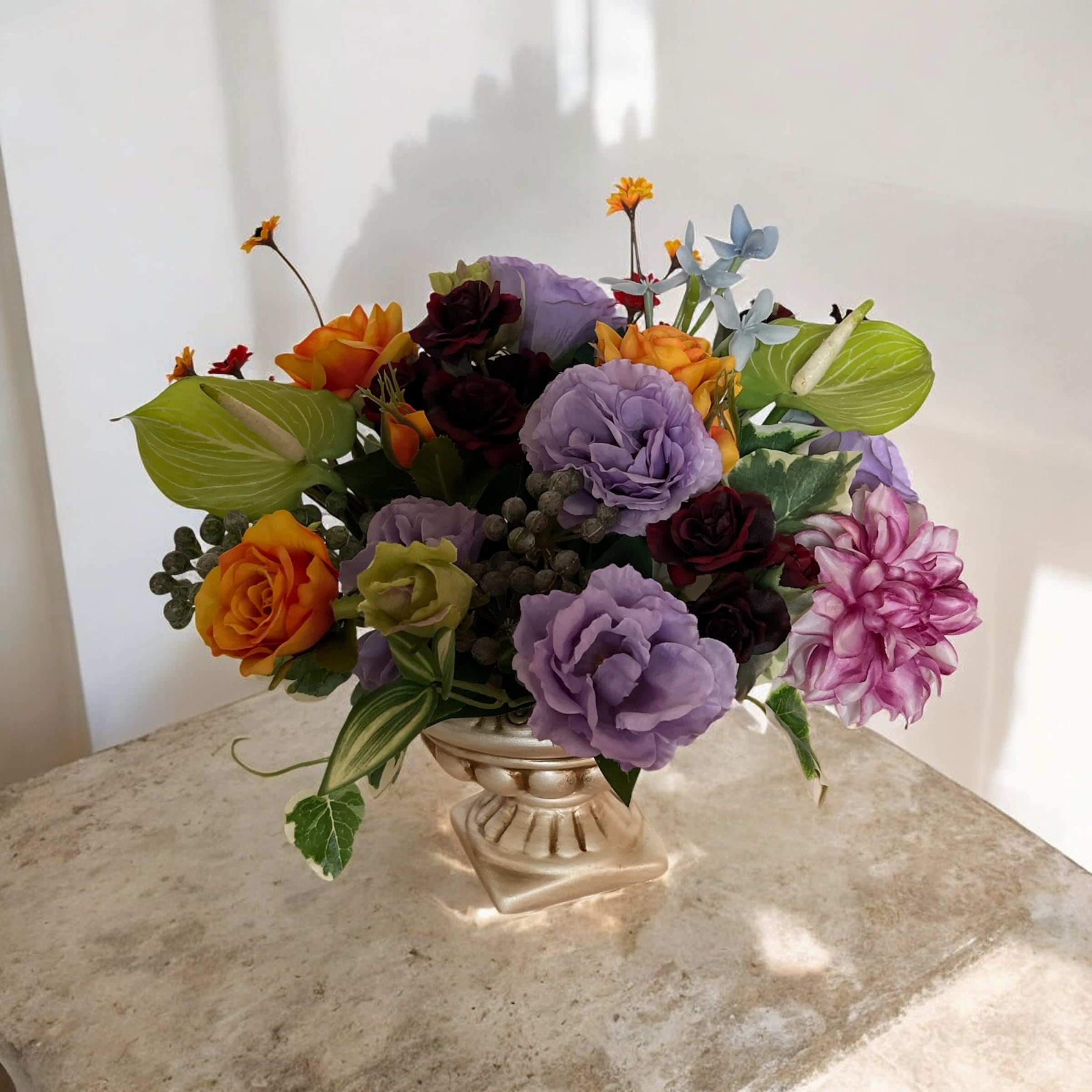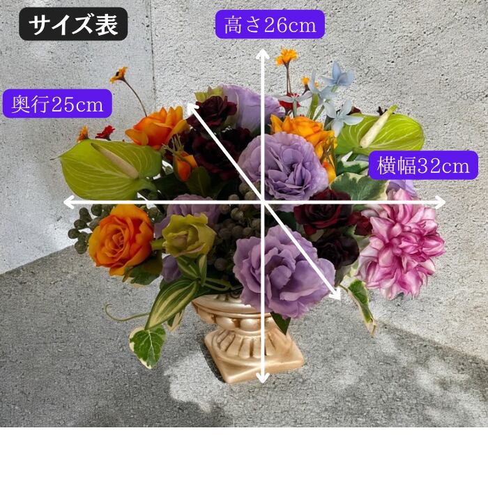 ♦︎こちらの商品は、エレガントなスタイルを楽しむ「トルコキキョウのテーブルフラワー」です。上品なオレンジバラとパープルのトルコキキョウをふんわりとアレンジしたデザインが特長で、食卓やリビングを華やかに彩ります。ナチュラルな印象を活かしたこのアイテムは、心地よい空間を創出し、訪れる人々を魅了します。品質の高いアーティフィシャルフラワーを使用し、まるで生花のような美しさを実現しています。