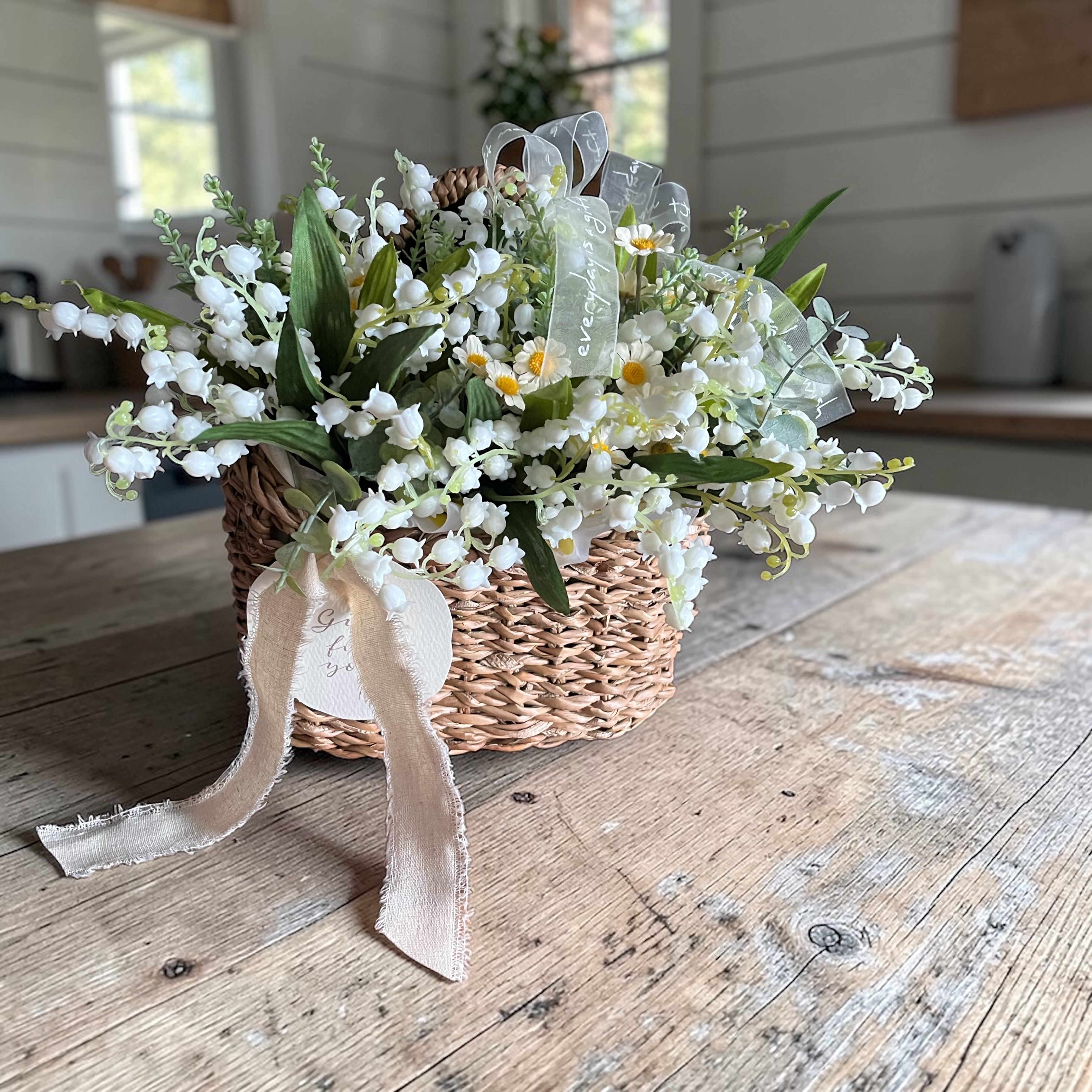 ♦︎ 使用花材:スズラン・マトリカリア・ユーカリ・ハーブグリーン・ラタンバスケット