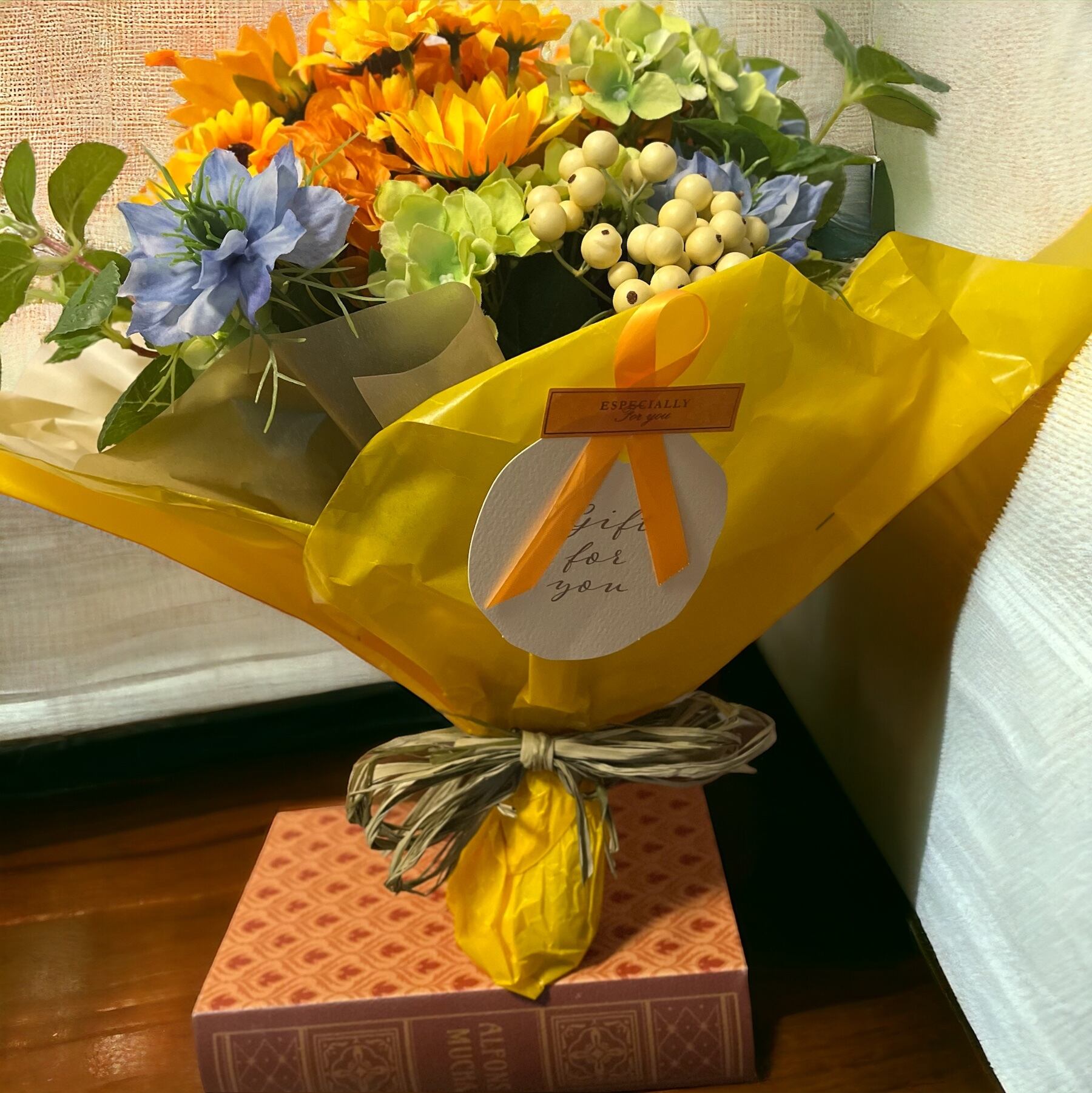 この「ヒマワリとニゲラのブーケ」は、夏の太陽を思わせる鮮やかな色合いが特徴です。
